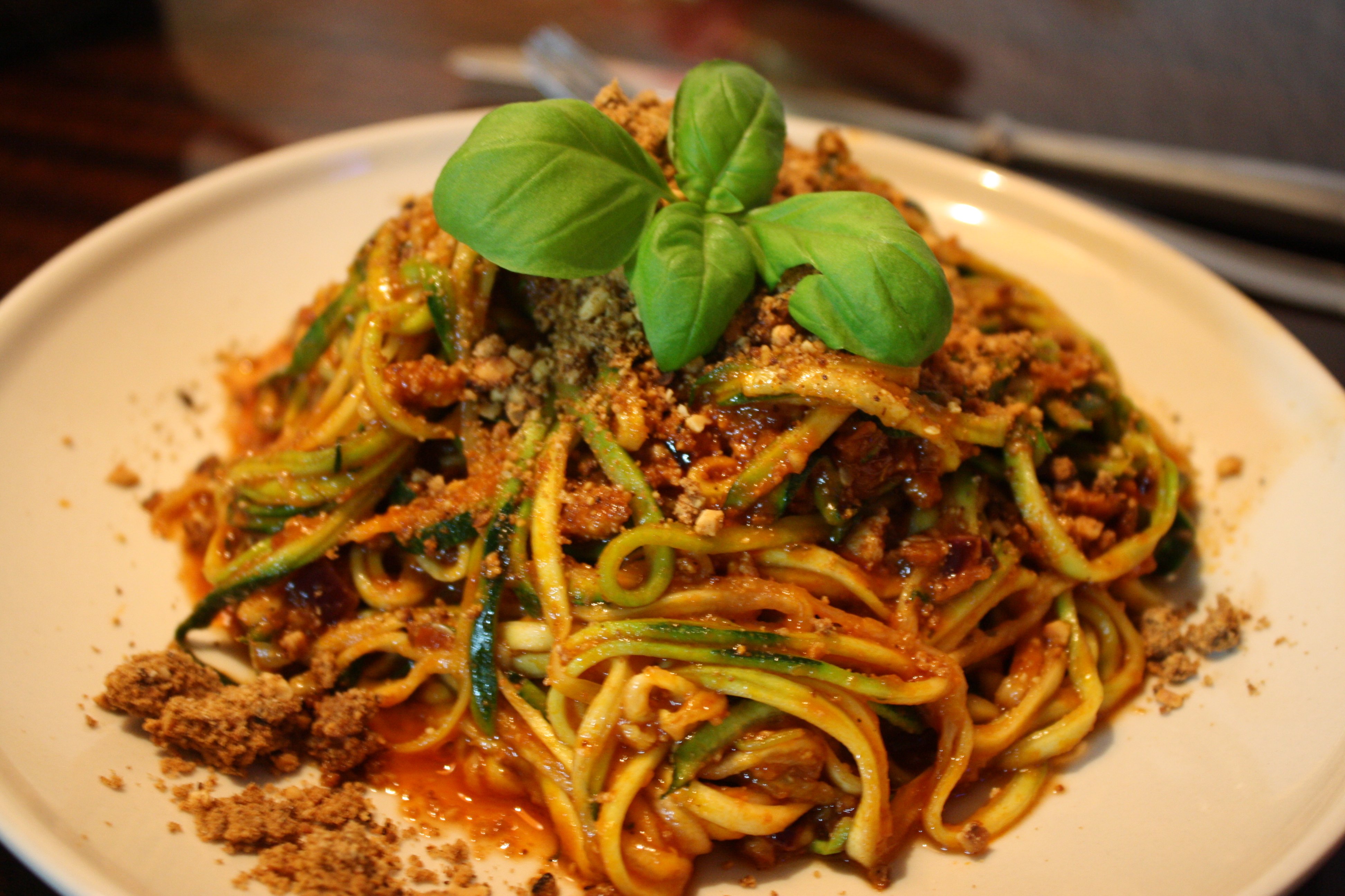 7- Lave as courgettes e corte as extremidades. Corte-as em tiras muito finas (tipo esparguete). De seguida, leve a cozer em água a ferver durante 1 minuto.