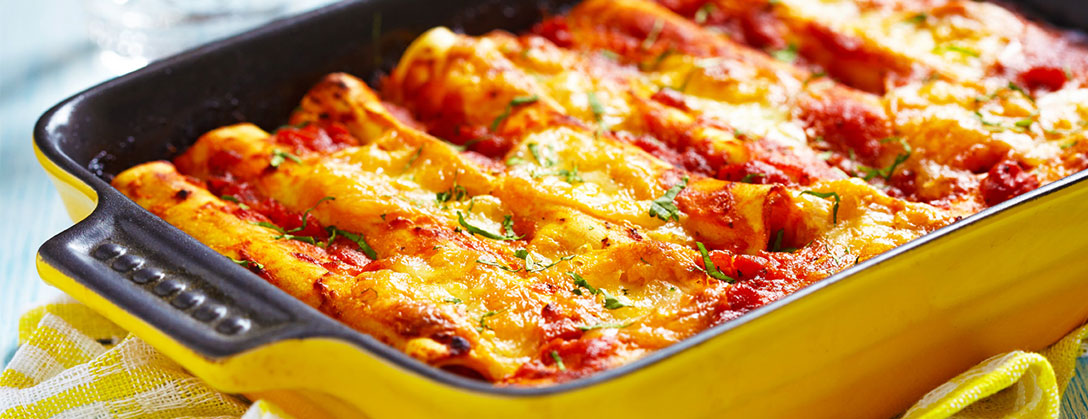 8- Coloque uma concha de molho de tomate num pirex, de seguida junte os canelones, a mozarela escorrida, cortada em cubos. Adicione o resto do molho de tomate e polvilhe com a mozarela ralada.