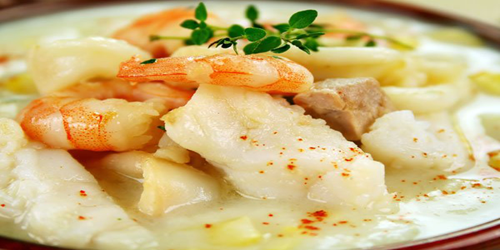 3º. Numa frigideira, meta uma quantidade suficiente de azeite para saltear os camarões. Salteie-os durante dois minutos, e incorpore-os na sopa. Na mesma frigideira, frite o robalo, durante dois minutos. Desfie e coloque-os também na mistura para a sopa.